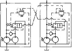 圖5為具有功率綜合的壓力傳感卸載回路,它由兩組略加變化的壓力傳感卸載泵組成,兩組泵由同一原動(dòng)機(jī)驅(qū)動(dòng),每臺(tái)泵接受另一卸載泵的導(dǎo)控卸載信號(hào)。此種傳感方式稱之為交互傳感,它可使一組泵在高壓下工作而另一組泵在大流量下工作。兩只溢流閥可按每個(gè)回路特殊的壓力調(diào)整,以使一臺(tái)或兩臺(tái)泵卸載。此方案減少了功率需求,故可采用小容量價(jià)廉原動(dòng)機(jī)。