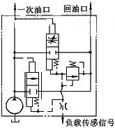圖6所示為負(fù)載傳感卸載回路。當(dāng)主控閥的控制腔(下腔)無負(fù)載傳感信號(hào)時(shí),泵的所有流量經(jīng)閥1、閥2排回油箱;當(dāng)給此控制閥施加負(fù)載傳感信號(hào)時(shí),泵向回路供液;當(dāng)泵的輸出壓力超過負(fù)載傳感閥的壓力預(yù)定值時(shí),泵僅向回路提供工作流量,而多余流量經(jīng)閥2的節(jié)流位置旁通回油箱。