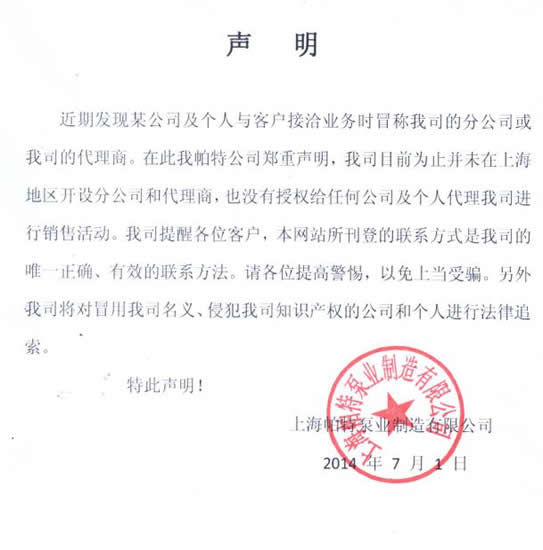 近期發(fā)現(xiàn)某公司及個(gè)人與客戶接洽業(yè)務(wù)時(shí)冒稱我司的分公司或我司的代理商。在此我帕特公司鄭重聲明,我司目前為止并未在上海地區(qū)開(kāi)設(shè)分公司和代理商,也沒(méi)有授權(quán)給任何公司及個(gè)人代理我司進(jìn)行銷售活動(dòng)。我司提醒各位客戶,本網(wǎng)站所刊登的聯(lián)系方式是我司的唯一正確、有效的聯(lián)系方法。請(qǐng)各位提高警惕,以免上當(dāng)受騙。另外我司將對(duì)冒用我司名義、侵犯我司知識(shí)產(chǎn)權(quán)的公司和個(gè)人進(jìn)行法律追索。