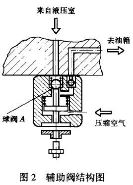 對(duì)于固定沖程隔膜泵,在啟動(dòng)前必須確保隔膜置于后支撐面。如果置于前支撐面。泵啟動(dòng)后,推桿驅(qū)動(dòng)液壓油作用在隔膜上,繼續(xù)往前運(yùn)動(dòng),對(duì)隔膜產(chǎn)生過(guò)大應(yīng)力,很易造成破裂。為保證泵啟動(dòng)前隔膜置于后支撐面,德國(guó)勒瓦公司在隔膜泵型號(hào)為G3F/M514ZS的泵頭上增加一個(gè)輔助閥(圖2),該閥安裝在液壓室的殼體上。輔助閥使0.3~0.7MPa的空氣進(jìn)入輔助閥活塞的下面,活塞克服彈簧力向上運(yùn)動(dòng),頂開(kāi)球閥 ,使液壓室和液壓油箱之間連通。泵體引液后,靠操作室中計(jì)量流體的壓力推動(dòng)隔膜向后運(yùn)動(dòng),使隔膜置于后支撐面,實(shí)現(xiàn)隔膜定位。同時(shí)液壓室中的液壓油通過(guò)輔助閥回流到液壓油箱。